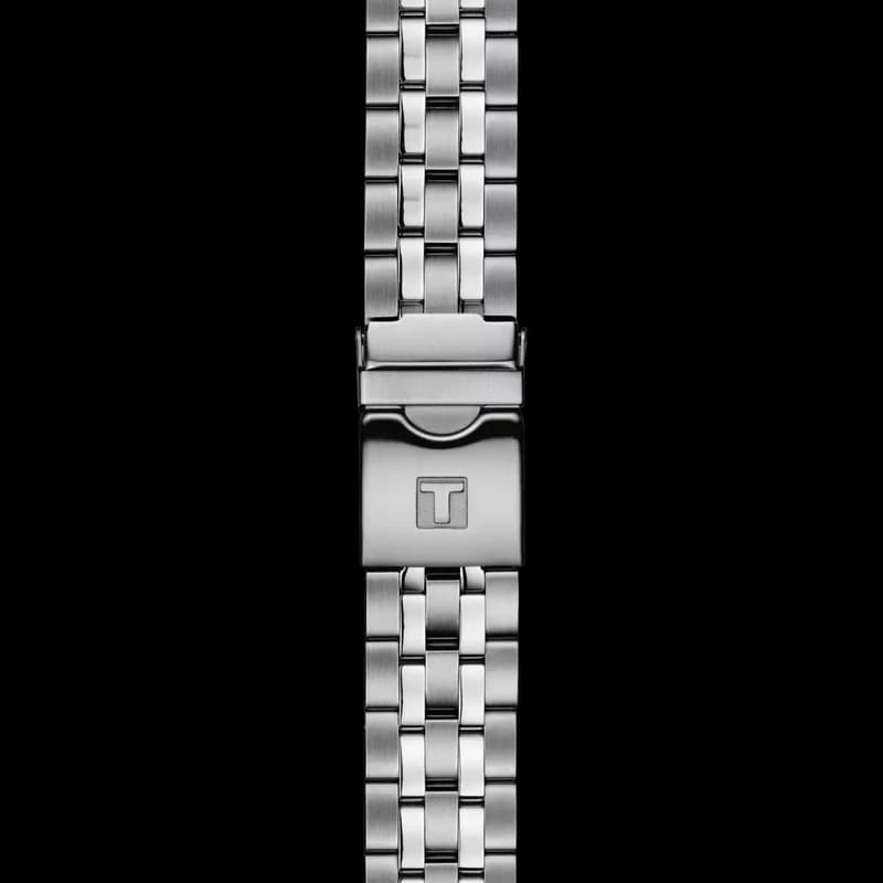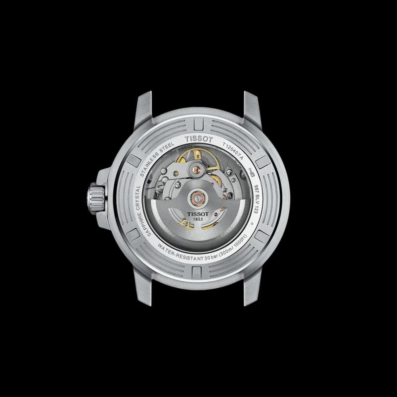 The Tissot Seastar 1000 is designed for watersport enthusiasts, combining robust construction with elegant design. It offers water resistance up to a pressure of 30 bar (300 m / 1000 ft), incorporating a 316L stainless steel case, a ceramic bezel ring, and a scratch-resistant sapphire crystal with antireflective coating. The screw-down crown and caseback provide additional water protection, while the see-through caseback reveals the Swiss automatic movement with a patented Nivachron balance spring and up to 80 hours of power reserve.
